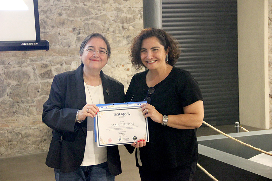 İzmir Kültür Sanat Fabrikası Arkeoloji Müze Yardımcısı Uzman Arkeolog Elif Erginer, gazeteci Saadet Erciyas’a ilgiyle izlenen sunumundan dolayı teşekkür belgesi verdi.